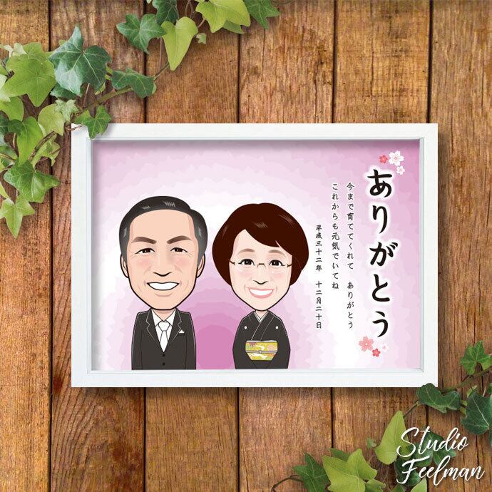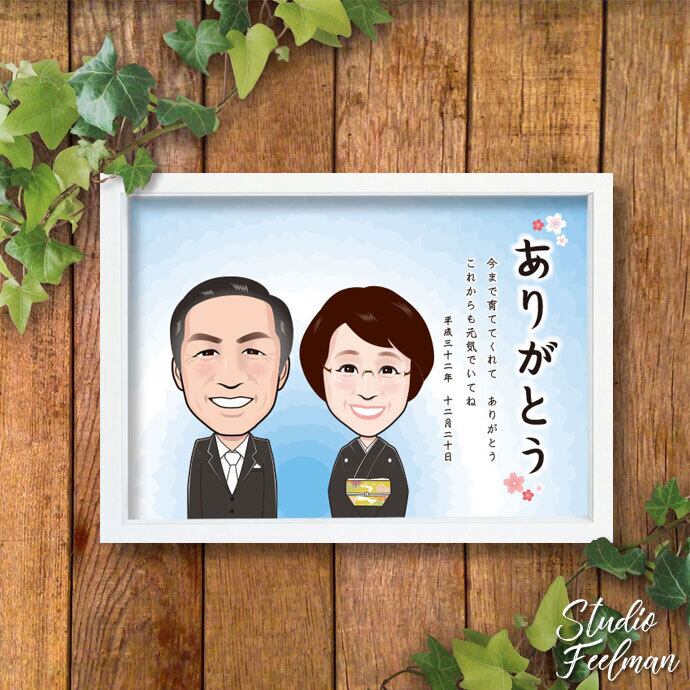 似顔絵サンクスボードはオンリーワンの記念品。ご両親への感謝の気持ちをこめて、結婚式のクライマックスを演出します。