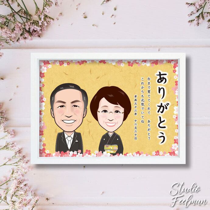 似顔絵サンクスボードはオンリーワンの記念品。ご両親への感謝の気持ちをこめて、結婚式のクライマックスを演出します。